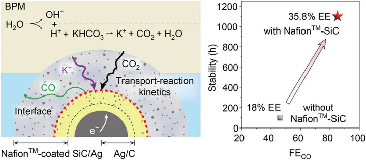 The electrochemical conversion of cost-effective bicarbonates into industrially relevant chemicals offers a sustainable, low-carbon-footprint alternative to feedstock production using renewable electricity. However, its performance is limited by low CO2 concentrations at catalyst surfaces and harsh acidic conditions that promote the hydrogen evolution reaction and catalyst degradation. In this study, we developed a robust ionomer–inorganic nanoparticle (NP) composite coating (5–15 μm Nafion–SiC NPs), positioned between the catalyst and bipolar membrane, enabling efficient dual-permeability of gaseous CO2 and liquid electrolyte to promote bicarbonate electrolysis over extended operation. Specifically, the Nafion perfluorocarbon chains on the assembled Nafion–SiC NPs interconnect to form a continuous aerophilic network that facilitates CO2 diffusion. Simultaneously, the interparticle voids between NPs provide hydrophilic pathways that permit efficient electrolyte transport. This prepared stratified electrode increases local CO2 concentration to 75% saturation and enriches K+ availability at electrocatalyst surfaces at cathodic potentials during bicarbonate electrolysis. Experiments validate a high CO2 permeance of ∼0.008 cm3 cm–2 s–1 cmHg–1 and a low ionic resistance of ∼0.85 Ω cm2 for the composite coating under wet conditions. Crucially, the electrically insulating Nafion–SiC NPs resist electric-field-induced K+ penetration to ensure long-term hydrophobicity and stable gas transport. This system achieved sustained bicarbonate-to-CO electrolysis over 1100 h with an 84–88% Faradaic efficiency and a 35.8% energy efficiency at 100 mA cm–2. Extending this gas–liquid dual-permeable coating strategy to Bi- and Sn-based electrodes enhanced bicarbonate-to-formate electroreduction, highlighting the generalizability of this gas–liquid dual-permeable design for advancing heterogeneous electrolysis at triple-phase interfaces.